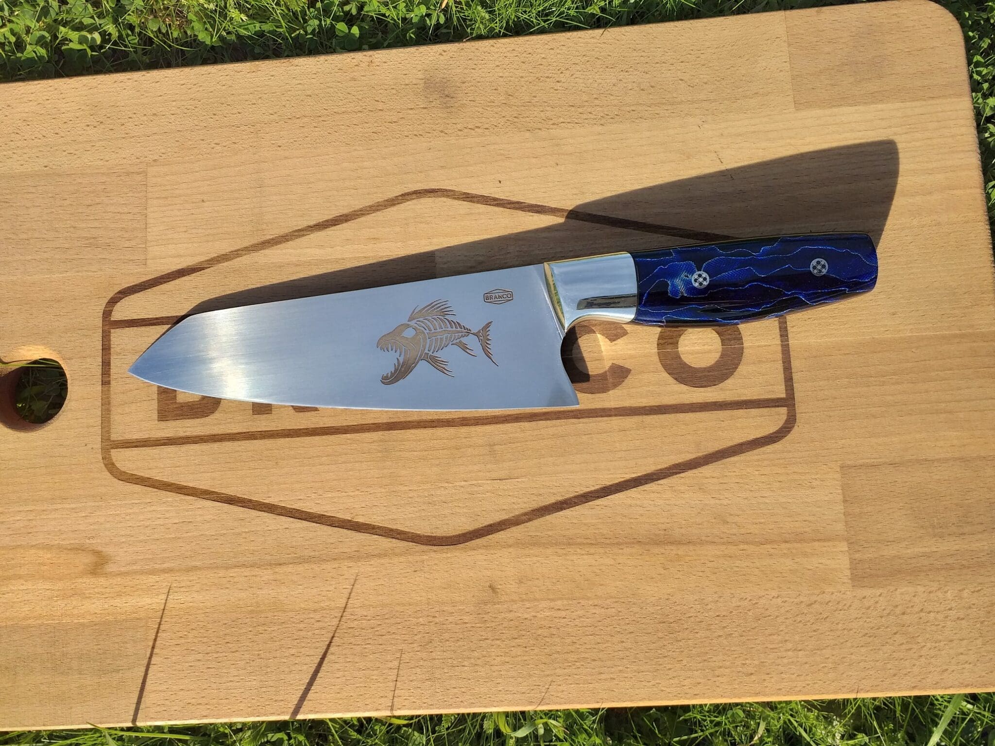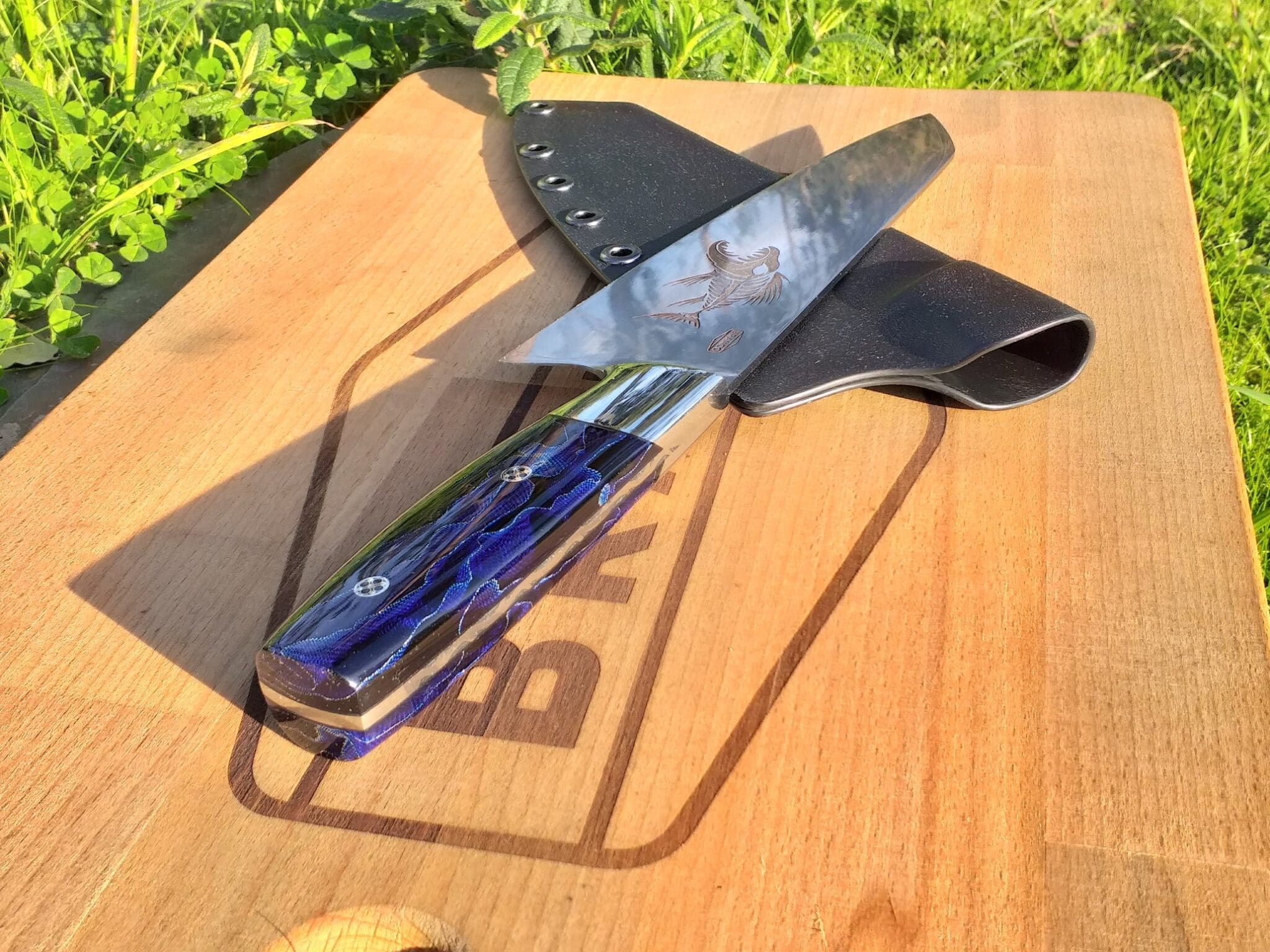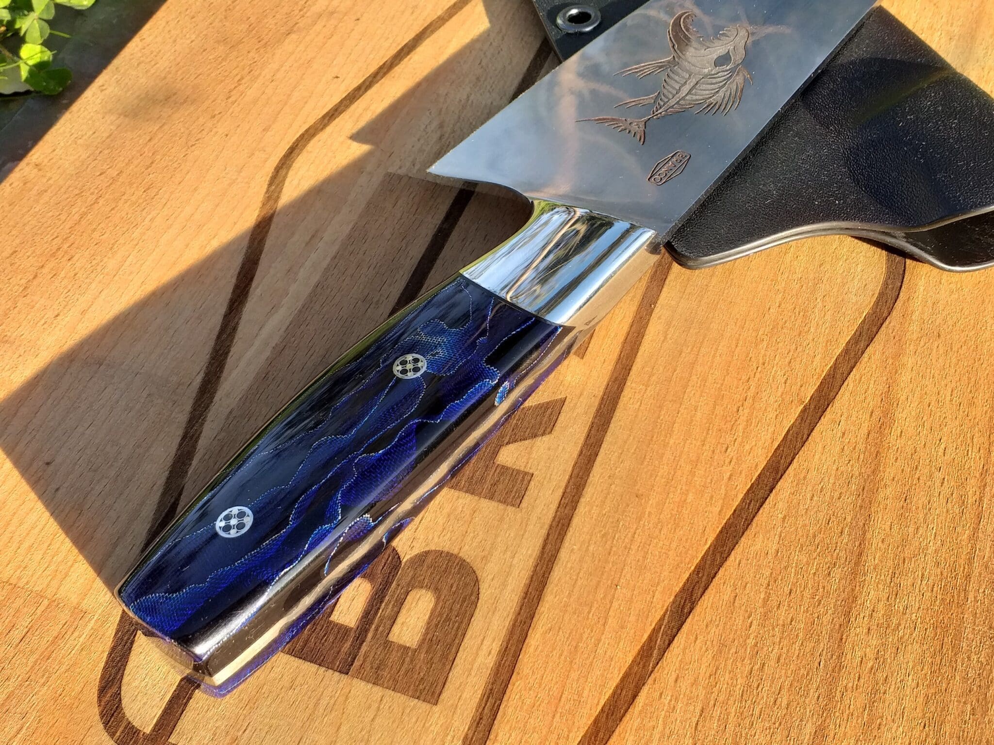 A gift for an avid fisherman. So the image of a tribal fish was picked for the blade. That mixed with the blue Raffir handle looks like this something fit for Triton himself.