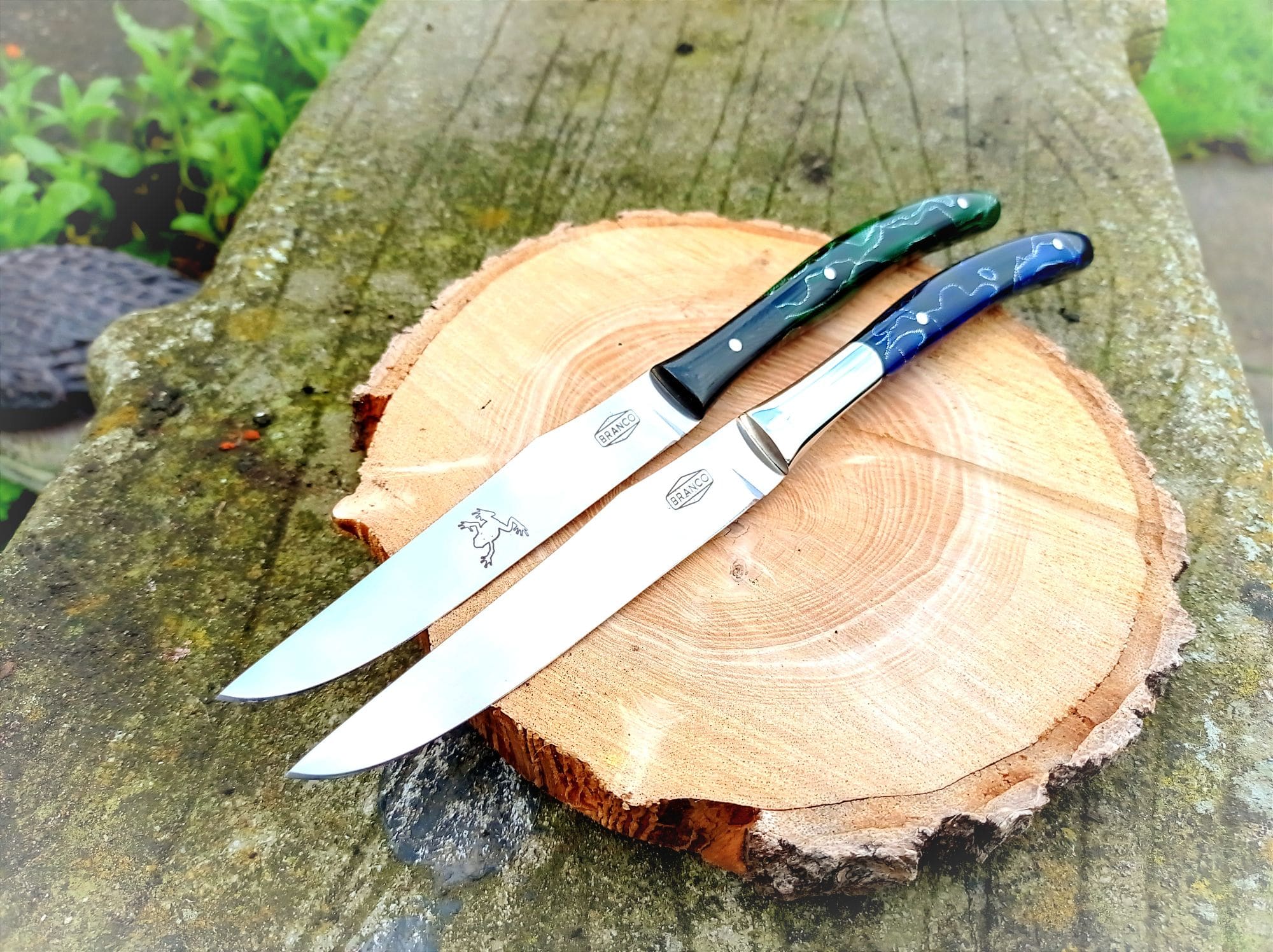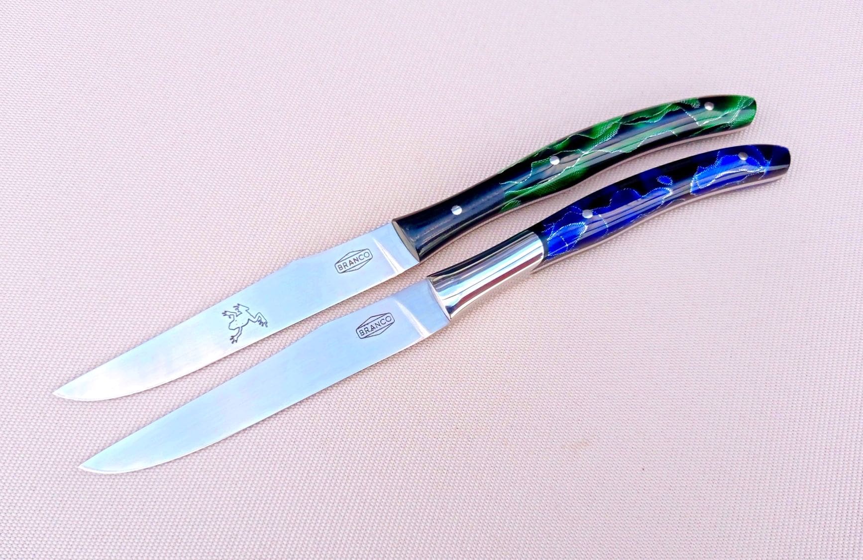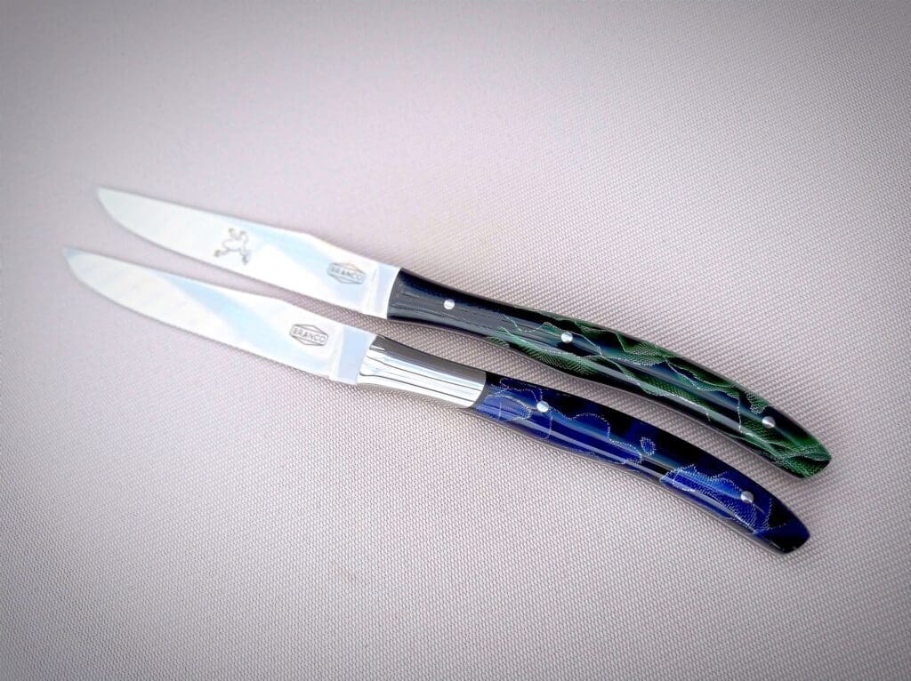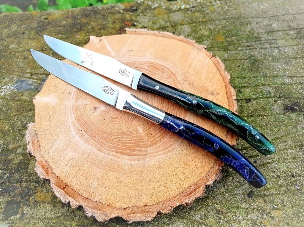 Loosely based on a French style Steak Knife. These knives were made for my sister in law and her husband. The same style but uniquely personalised.